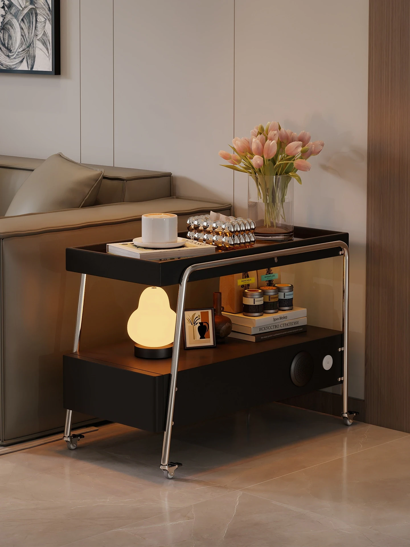 Elegant and Functional Movable Sofa Side Table - Premium Solid Wood Italian Minimalist Smart Side Cabinet for Luxe Living Spaces