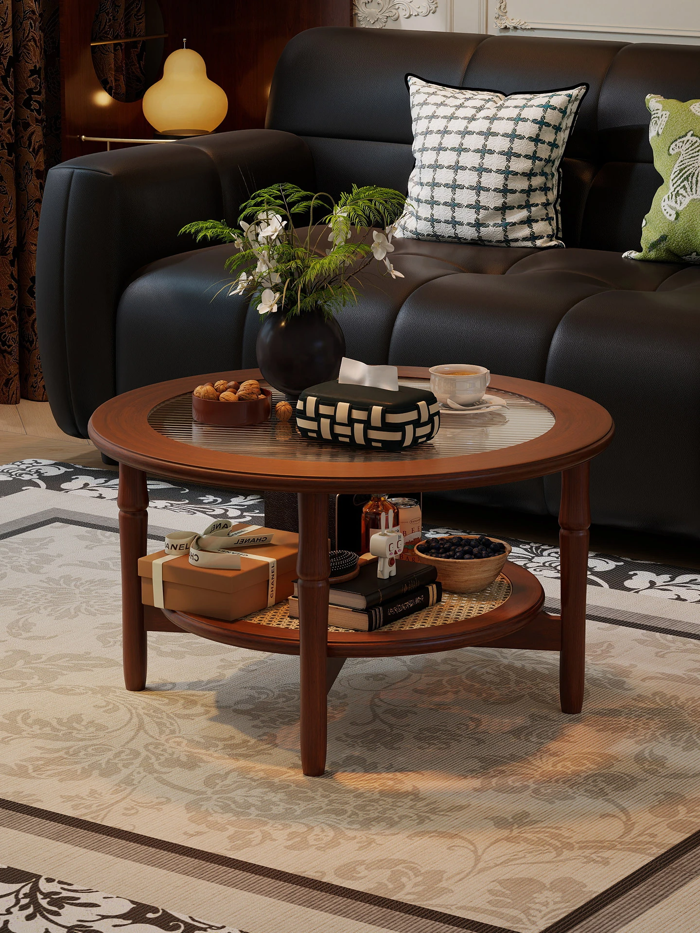 French Vintage Solid Wood Round Coffee Table - Stylish Glass Double-Layer Tea Table for Home Use, Perfect for Small Living Rooms, with Rattan Accents