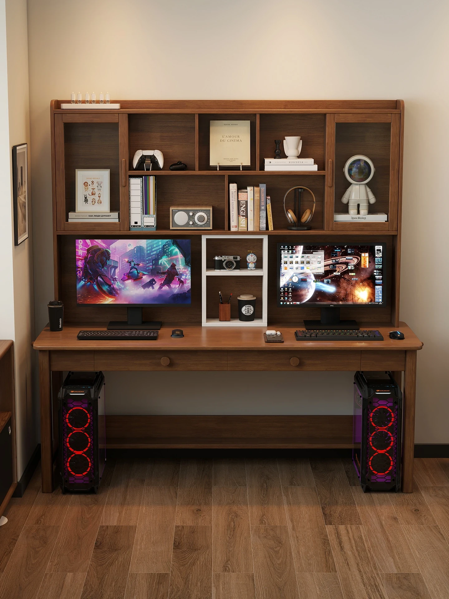 Solid Wood Walnut Double Desk with Bookshelf – Perfect for Home, Bedroom, or Living Room Study & Reading. Embrace Vintage Charm for Your Learning Space!