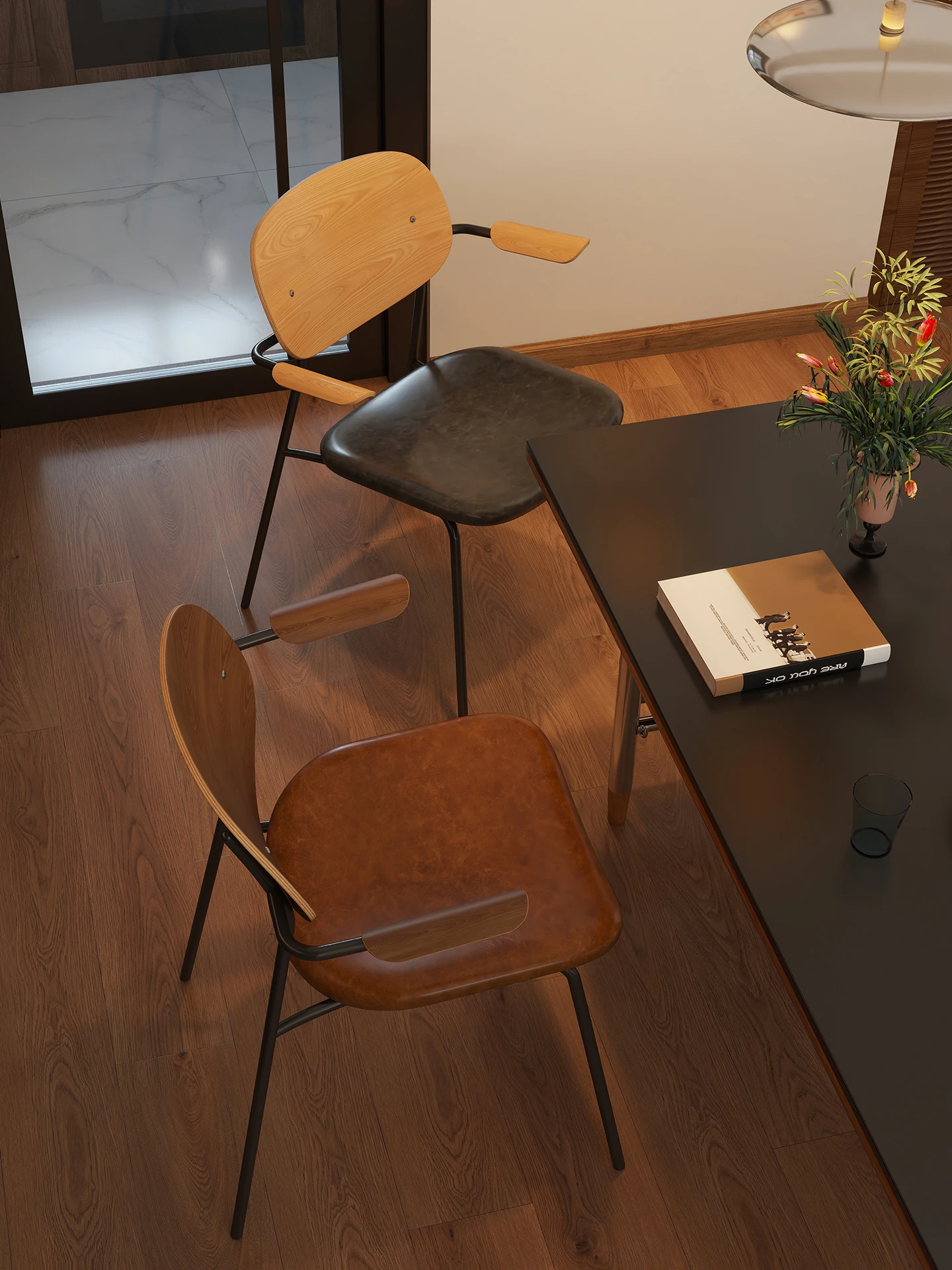Vintage Solid Wood Dining Chair - Minimalist Scandinavian Style with Armrests and Backrest, Perfect for Restaurants. Features Iron Frame and Hanging Design for Space-Saving Convenience. Ideal for Modern Dining Spaces.