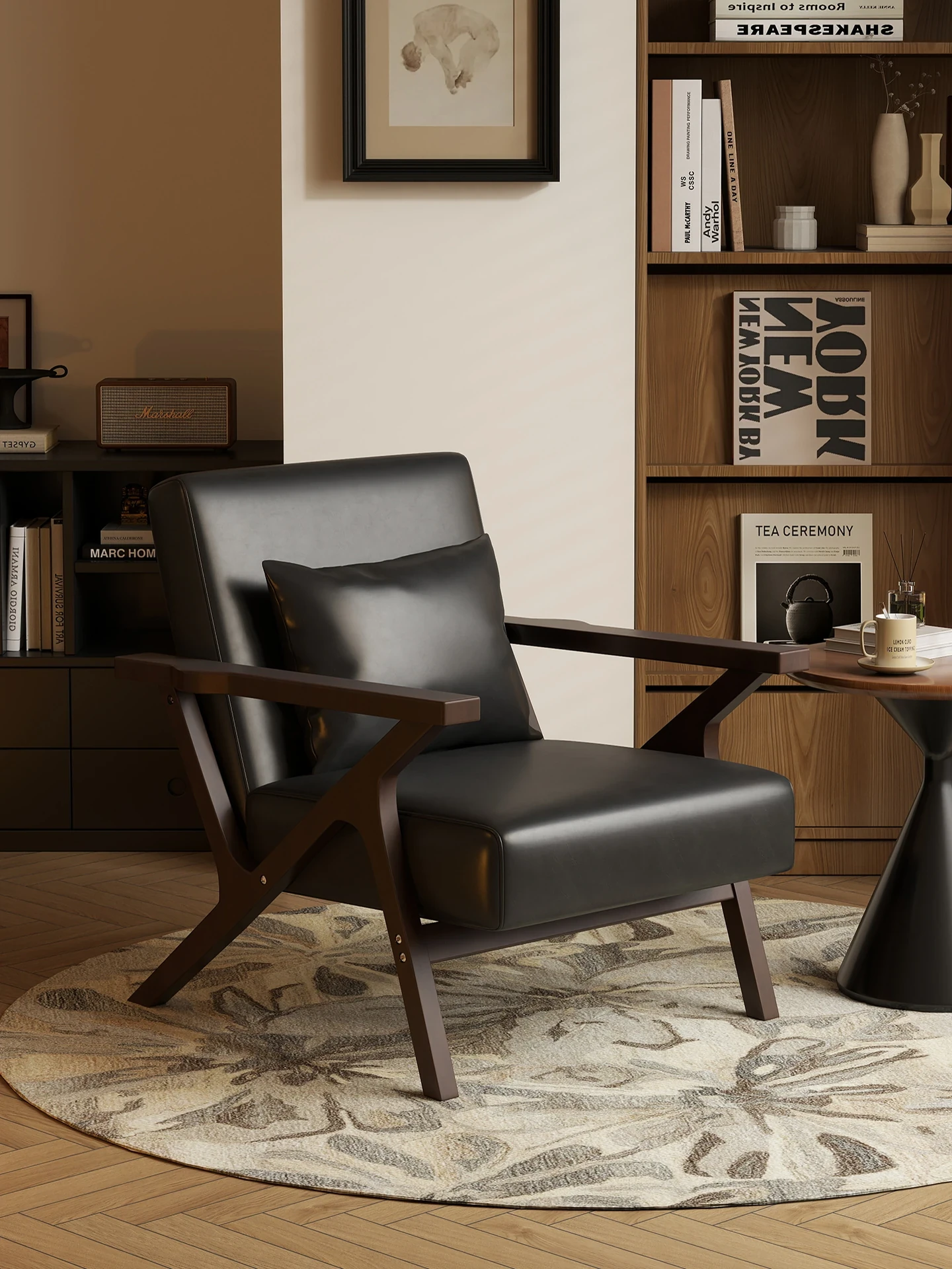 Vintage-Inspired Solid Wood Single Armchair - Retro Lounge Chair for Living Room, Balcony, or Study with Waxed Leather Upholstery and Comfortable Backrest