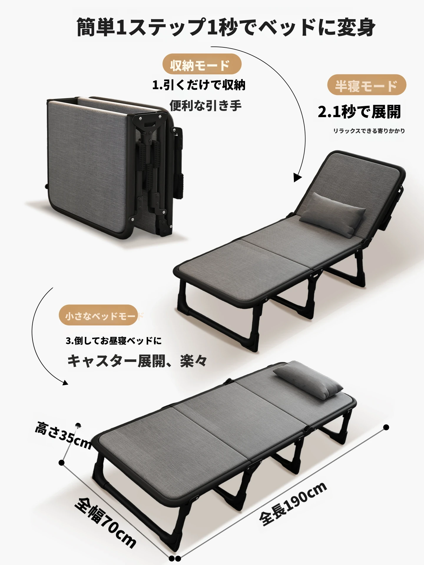 190*70CM | グレー | 背もたれ6段調節 | スポンジタイプ