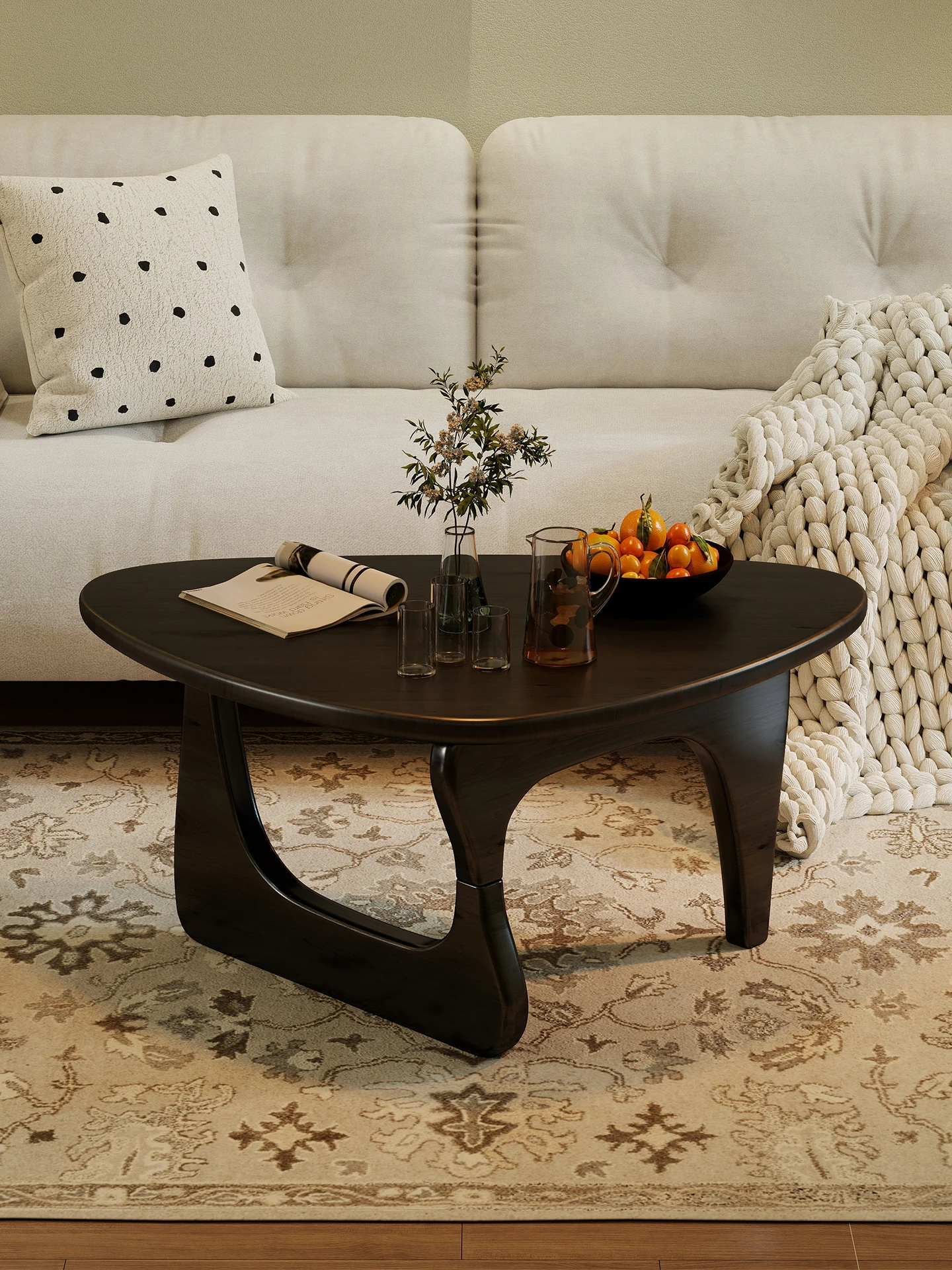 ヴィンテージ風の無垢材テーブル、リビング用・小スペースに最適な高級三角形デザインのサイドテーブル。シンプルで移動可能、スタイリッシュなロータイプのテーブルで、居心地の良い空間を演出します。
