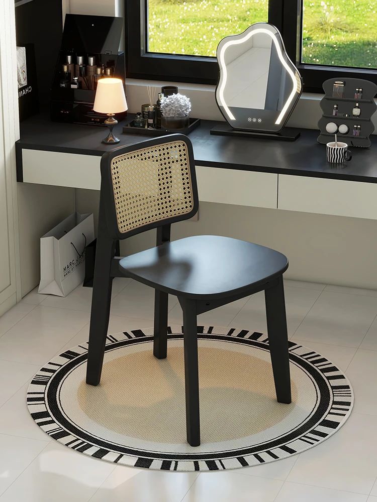 ヴィンテージ風の無垢材メイクアップスツール|女性向け寝室にぴったりな化粧台用背もたれ付き椅子|ラグジュアリーな雰囲気を演出する高級感あふれるデザイン