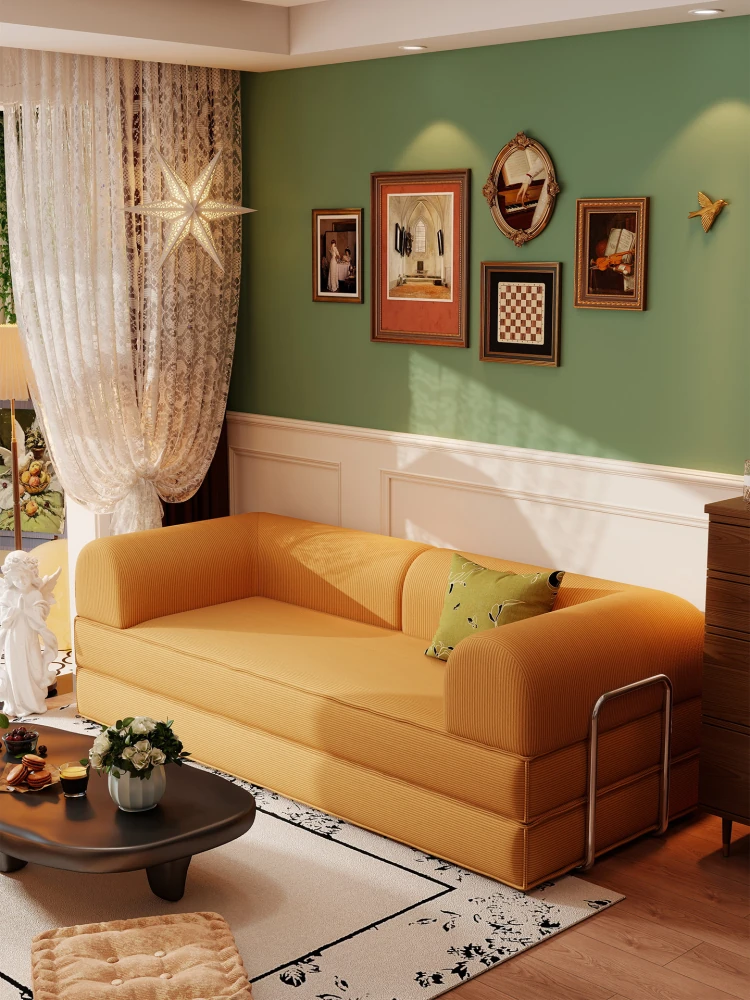 モジュール式ファブリックソファ 小型リビング向け ダブルスリープシート ストレートデザイン レトロフレンチスタイル 折りたたみ&二用途のプディングソファベッド。快適さとスタイルを両立した理想的な空間作りをサポートします!