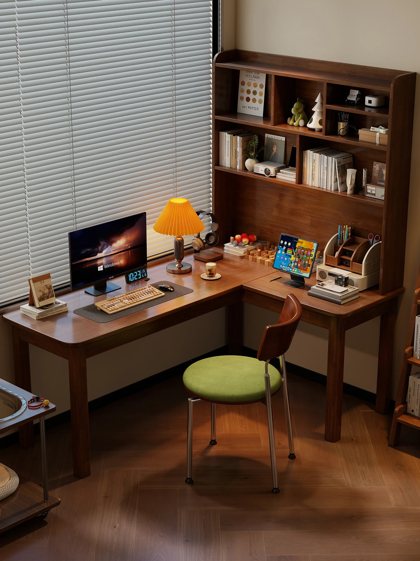 天然木材使用のコーナーデスク&本棚一体型!学生や家庭用に最適なL字型コンピューターデスク。省スペースで壁に寄り添うデザイン。おしゃれで機能的な学習環境を提供します!